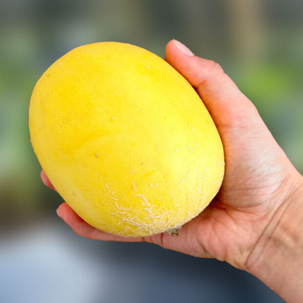 Gul minimelon med hög sötma och tunt skal; Skala den som ett äpple! Perfekt till hobbyodling. Planthöjd upp till 2 meter. Går från grönt till ljusgul vid mognad.